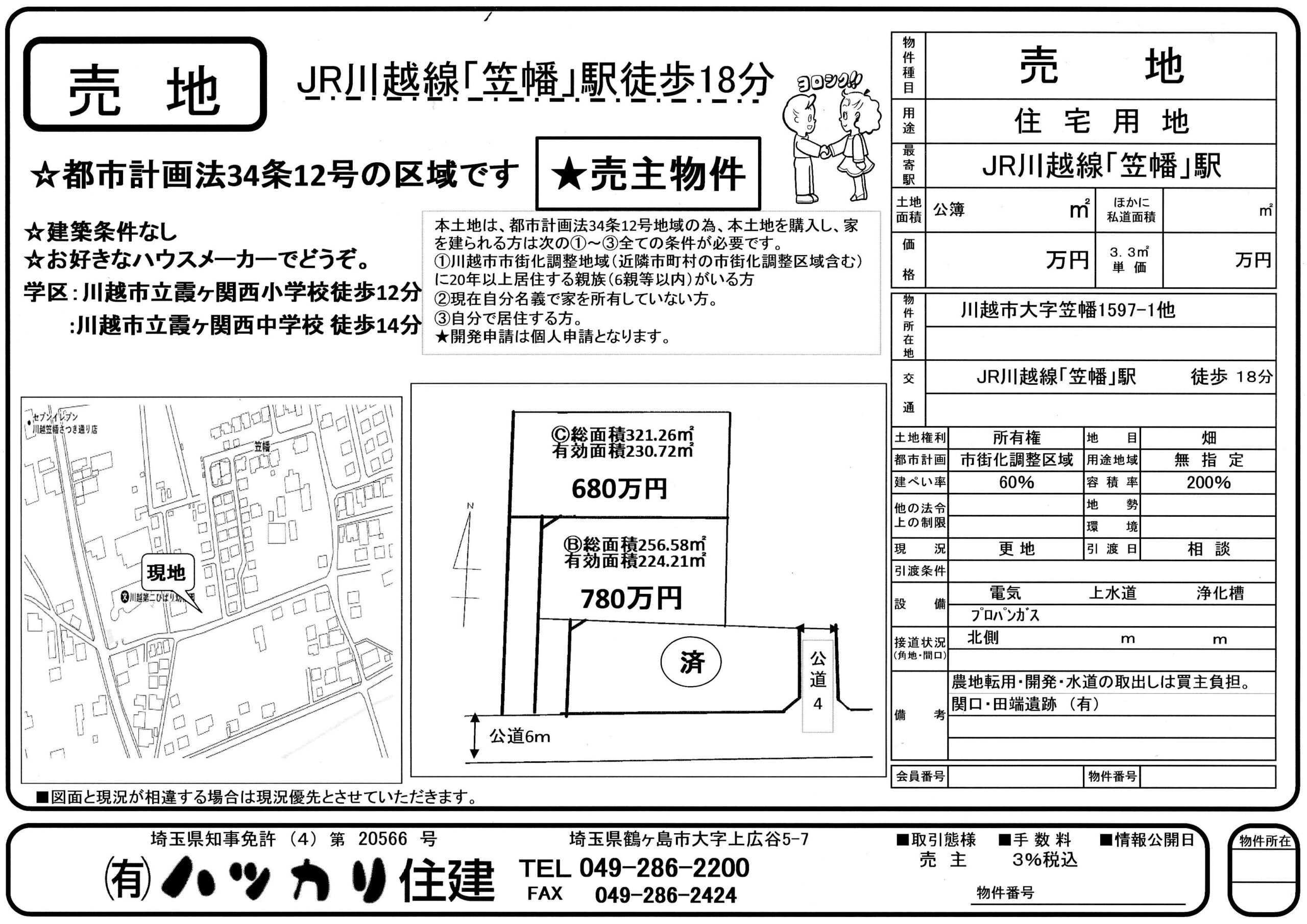売地情報 / 680万円から780万円 / 川越市大字笠幡 / JR川越線笠幡駅徒歩18分