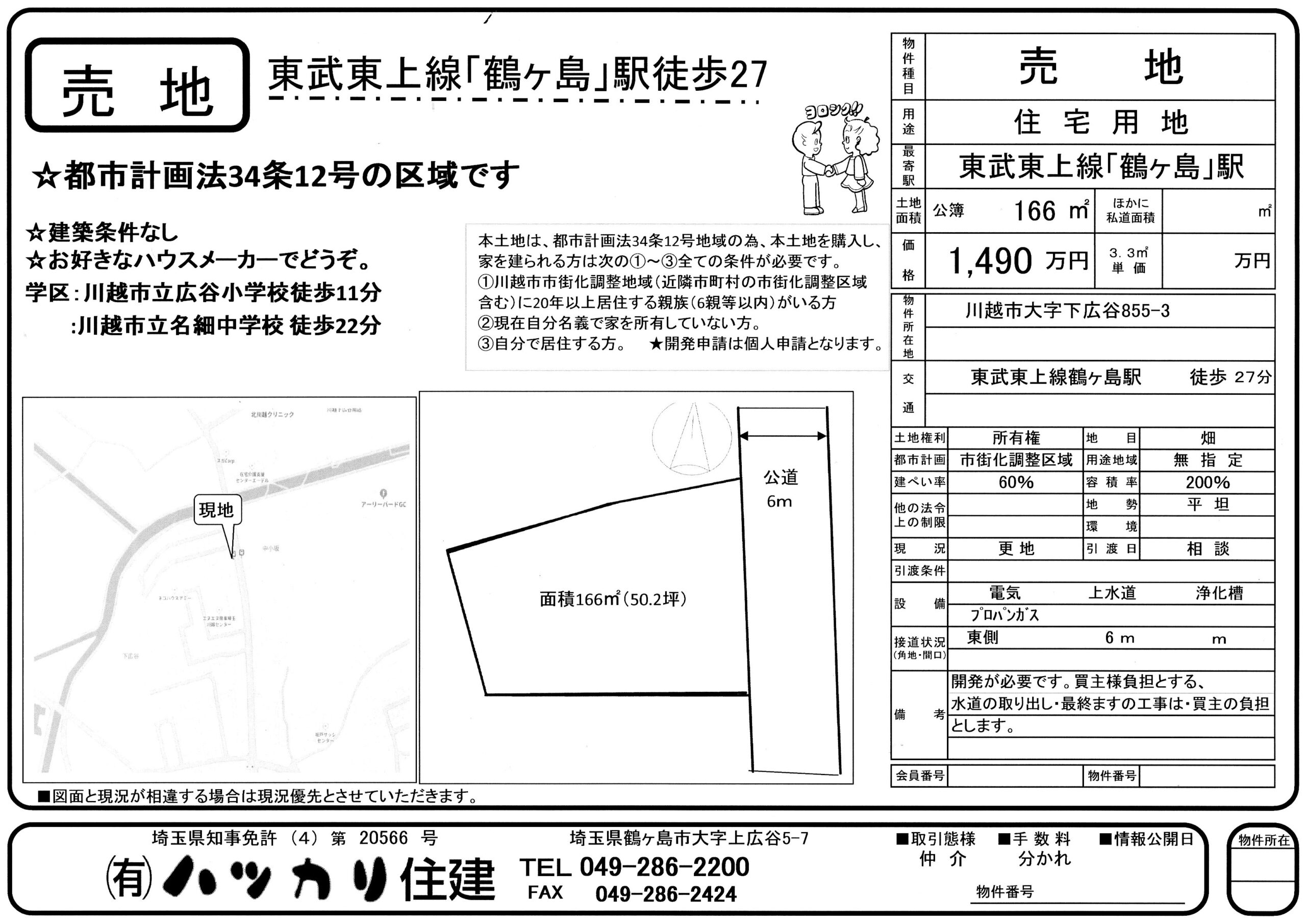 売地情報 / 1,490万円 / 川越市大字下広谷 / 鶴ヶ島駅徒歩25分