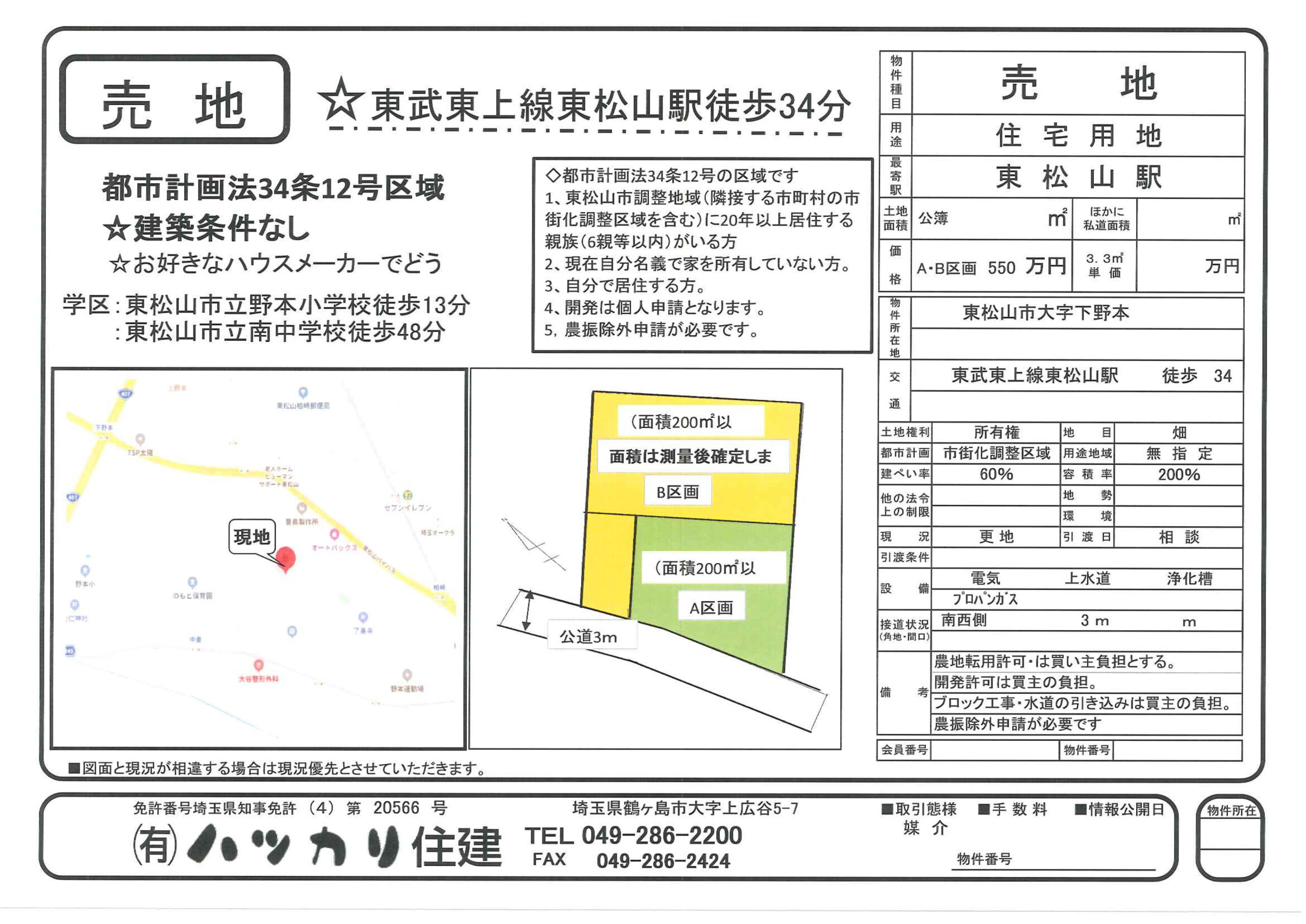 売地 / 550万円 / 東松山市大字下野本 / 東武東上線東松山駅徒歩34分