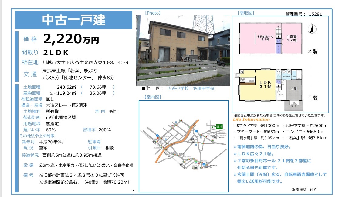 中古住宅 / 2,220万円 / 川越市大字下広谷/ 若葉駅 バス8分 亭歩8分