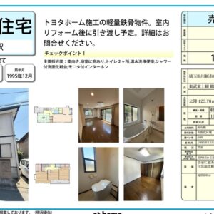 | 備 考 | 浴室に窓有り、トイレ2ヶ所、温水洗浄便座、シャワー付き洗面化粧台、マにター付インターホン | ||